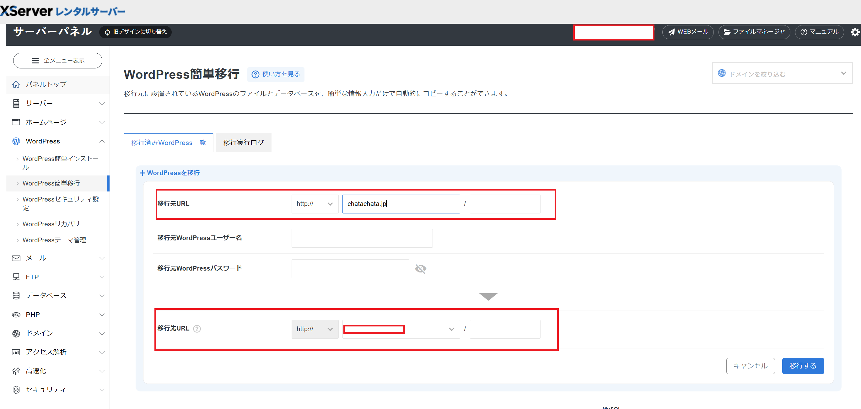 - 移行先URLにWordPress移行先のドメイン(今回はXserverに最初から割り当てられているドメインにしました)