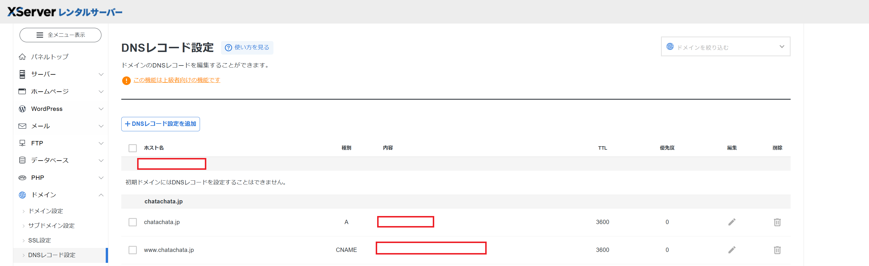 Xserverではサーバーパネルからドメイン - DNSレコード設定にあるAレコードとCNAMEにVercelで提示されたレコードを設定することで向き先をVercelに変えます。